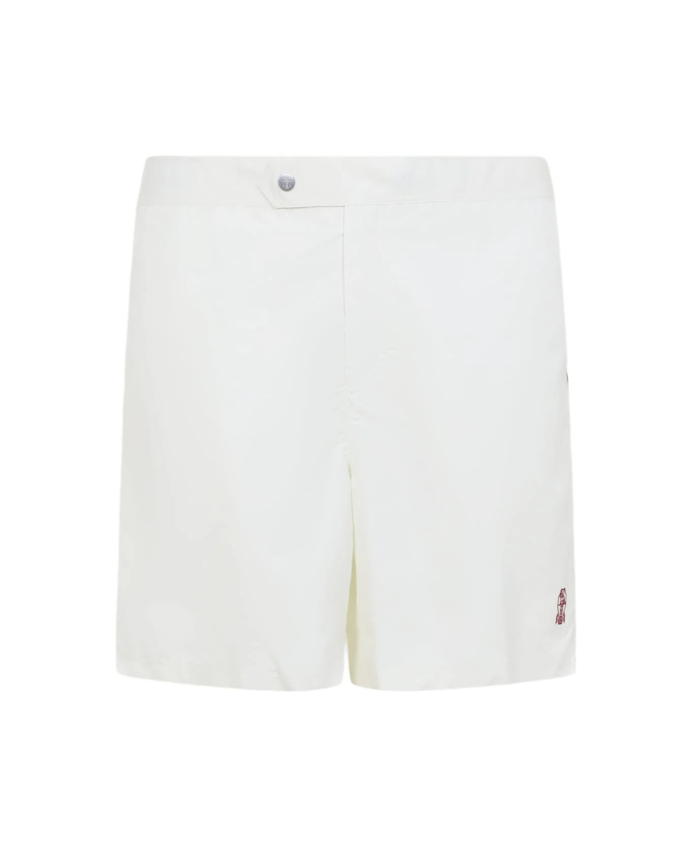 Brunello Cucinelli White Logo Embroidered Buttoned Swim Shorts. White tech fabric, regular waist, front button fastening, contrasting red trims. Side buckled fastening on waist, 3 pocket style. Embroidered logo in contrasting red. Made in: Italy Color: Panama Model number: MW817045CNH15