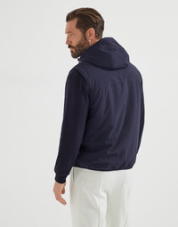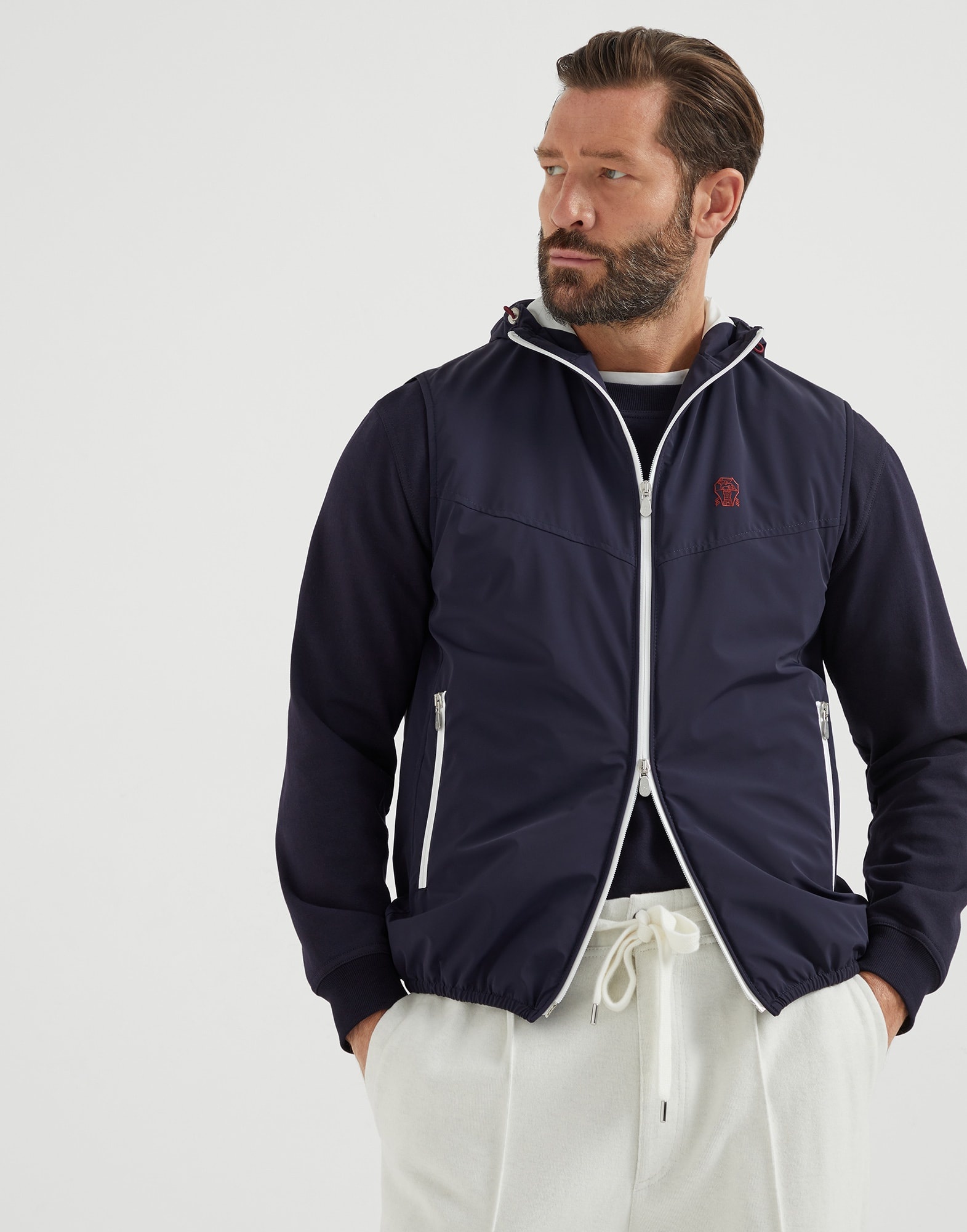 Refined materials enrich the sporty style of the Travelwear line, dedicated to moments of relaxation and leisure. This hooded vest is practical and functional thanks to the unique features of the technical nylon fabric: smooth and luminous on the outside to enhance the refined seasonal nuances, while, on the inside, it integrates a protective membrane that shields from water and wind. The comfortable and regular fit is complemented by the Thermore® padding and by the iconic logo detail on the chest. MATERIALS Nylon is a lightweight fabric equipped with a thin inner membrane that improves weather-resistance without compromising breathability. A small percentage of stretch fiber provides added comfort, while the lightweight Thermore® padding ensures a balanced weight without compromising adequate protection. DETAILS Adjustable drawstring hood Two-way zip closure Synthetic fabric lining Two interior pockets with button and pen holder Hand pockets with zipper Elasticized hem Thermore® padding 83% NYLON, 17% ELASTANE