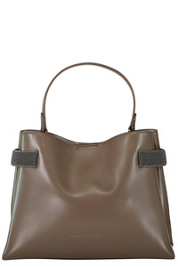 DETAILS AND INSIGHT Brunello Cucinelli essence top handle bag in tawny. Refined Calfskin Removable Crossbody Strap 13 x 5 x 9.84" Fits IPhone 16 Pro Max Made in Italy Style MBTKD2503-C8772