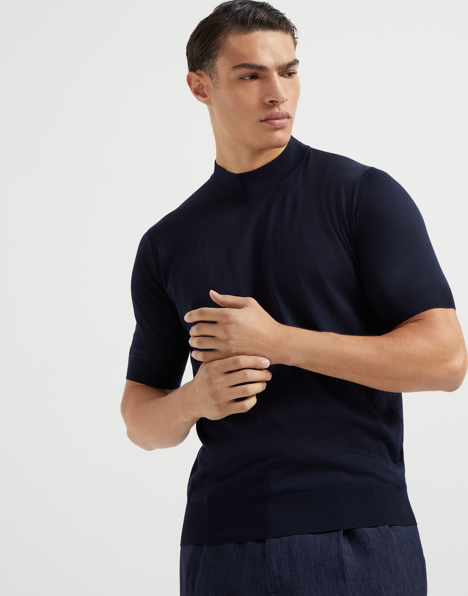 The superior quality of Brunello Cucinelli yarns is best expressed in this short sleeve Extra-light knit T-shirt. The special yarn combines the natural qualities of silk and cotton to create an ultra-lightweight material against the skin that enhances the season’s colors. The classic fit is defined by the mock neck and ribbed edges. MATERIALS Thanks to a careful selection of very fine fibers, the silk and cotton Extra-light knit is lightweight and extremely comfortable to wear, with a fluid, impalpable feel that enhances the natural qualities of the yarn. DETAILS Funnel neck in rib knit Regular shoulder Rib knit cuffs and bottom band Plain stitch 62% SILK, 38% COTTON