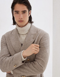 The blend of selected fibers elevates the essential, classic feel of this one-and-a-half-breasted deconstructed blazer in silk, wool and cashmere flannel. The distinctive mottled effect of the flecked yarn brings to life the lightweight checked flannel, which enhances the garment's silhouette, completed by patch pockets and metal buttons. The “Solomeo Shoulder”, named after the hamlet where the company is located, characterizes the Brunello Cucinelli blazer with signature proportions. The tapered and pronounced cut of the shoulder enhances the male physique without the need for padding. MATERIALS The checked flannel blends the comfort, warmth and lightness of the natural fibers with a classic pattern inspired by the world of tailoring. The crafting of the flecked yarn enriches the material’s texture with the distinctive mottled color. The lining completes the garment and provides added comfort. DETAILS 6 metal button closure Peak lapel Patch pockets, ticket pocket and chest pocket Cuffs have four metal buttons and functional buttonholes Cupro half lining Two interior pockets with button closure and pen holder Double back vent Drop 7 51% SILK, 47% WOOL, 2% CASHMERE