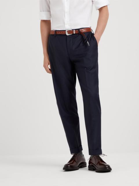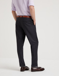 The excellence of Brunello Cucinelli materials enriches the classic feel of these Super 150s Tasmanian virgin wool Four Season twill trousers which are perfect to wear year-round. Their formal fit offers regular proportions both through the seat and along the leg. MATERIALS The clean and elegant appearance of the twill texture is combined with high quality Tasmanian wool. The processing of the very fine 150s yarn allows the creation of a lightweight fabric that is also compact and very comfortable. DETAILS Zip closure with double button and backing button Slanted front pockets Back welt pockets with button 18.5 cm (7,28") hem Formal fit: the fit is characterized by regular proportions in the seat and straight lines down the leg 100% VIRGIN WOOL