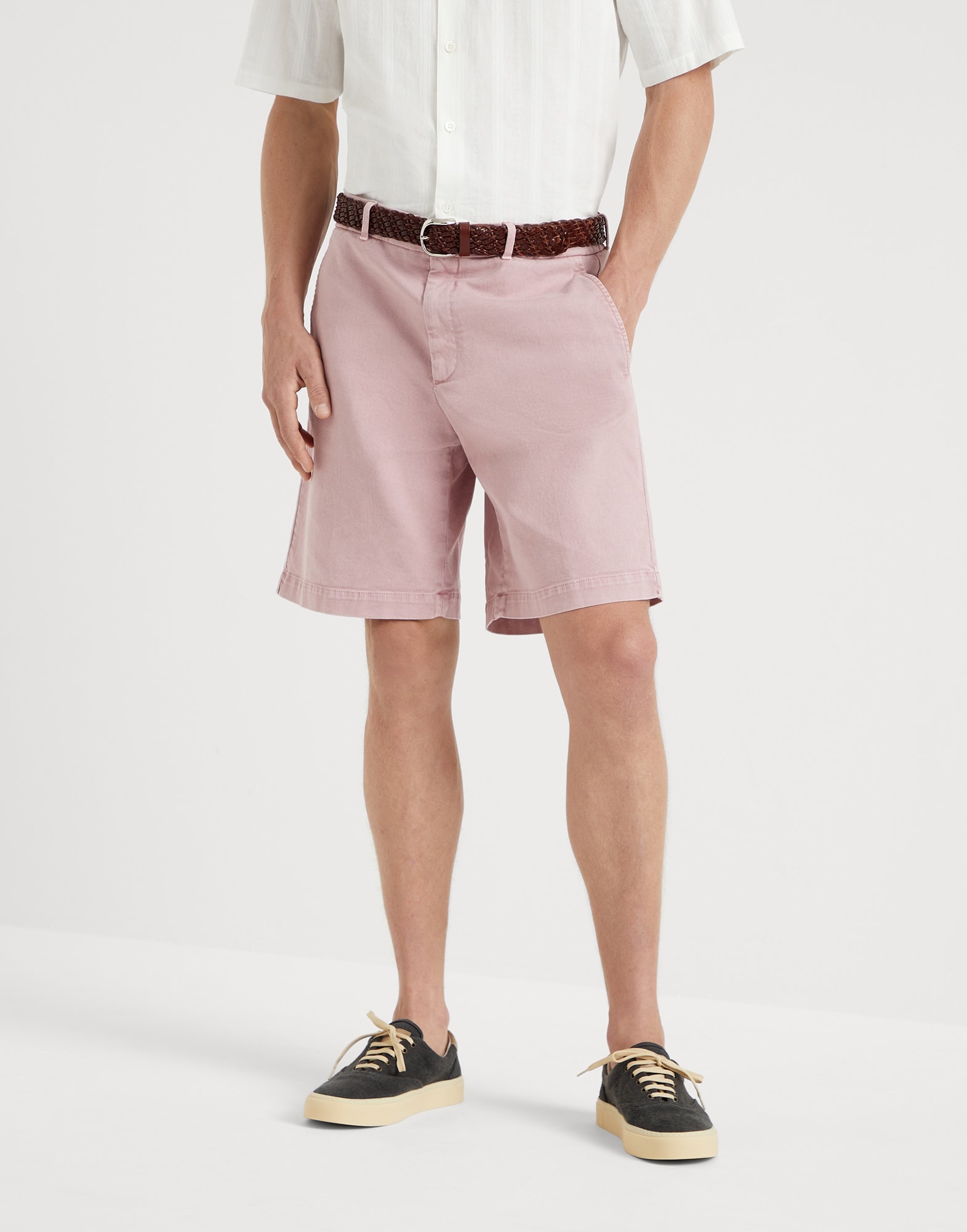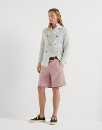 The season's colors enrich the informal style of these garment dyed comfort cotton Bermuda shorts, characterized by a pleasantly light and comfortable texture. The garment’s fit reflects Brunello Cucinelli’s classic feel and showcases a regular cut down the leg. MATERIALS 9.1 oz. dyed cotton denim is a lightweight fabric enriched with a very small percentage of spandex that provides added comfort. DETAILS Zip closure with button and backing button Back welt pockets 99% COTTON, 1% ELASTANE