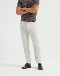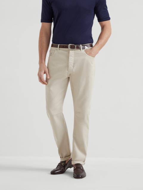 Garment-dyed comfort denim leisure fit five-pocket trousers