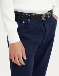 The seasonal nuances enrich the iconic style of these garment-dyed denim five-pocket pants, characterized by a lightweight and comfortable texture. The traditional fit expresses the classic Brunello Cucinelli style and features regular lines along the leg. MATERIALS 9.1 oz. dyed cotton denim is a lightweight fabric enriched with a very small percentage of spandex that provides added comfort. DETAILS Zip closure with button Front pockets with watch pocket Back patch pockets Traditional fit: the fit is characterized by regular proportions in the seat and straight lines down the leg 99% COTTON, 1% ELASTANE