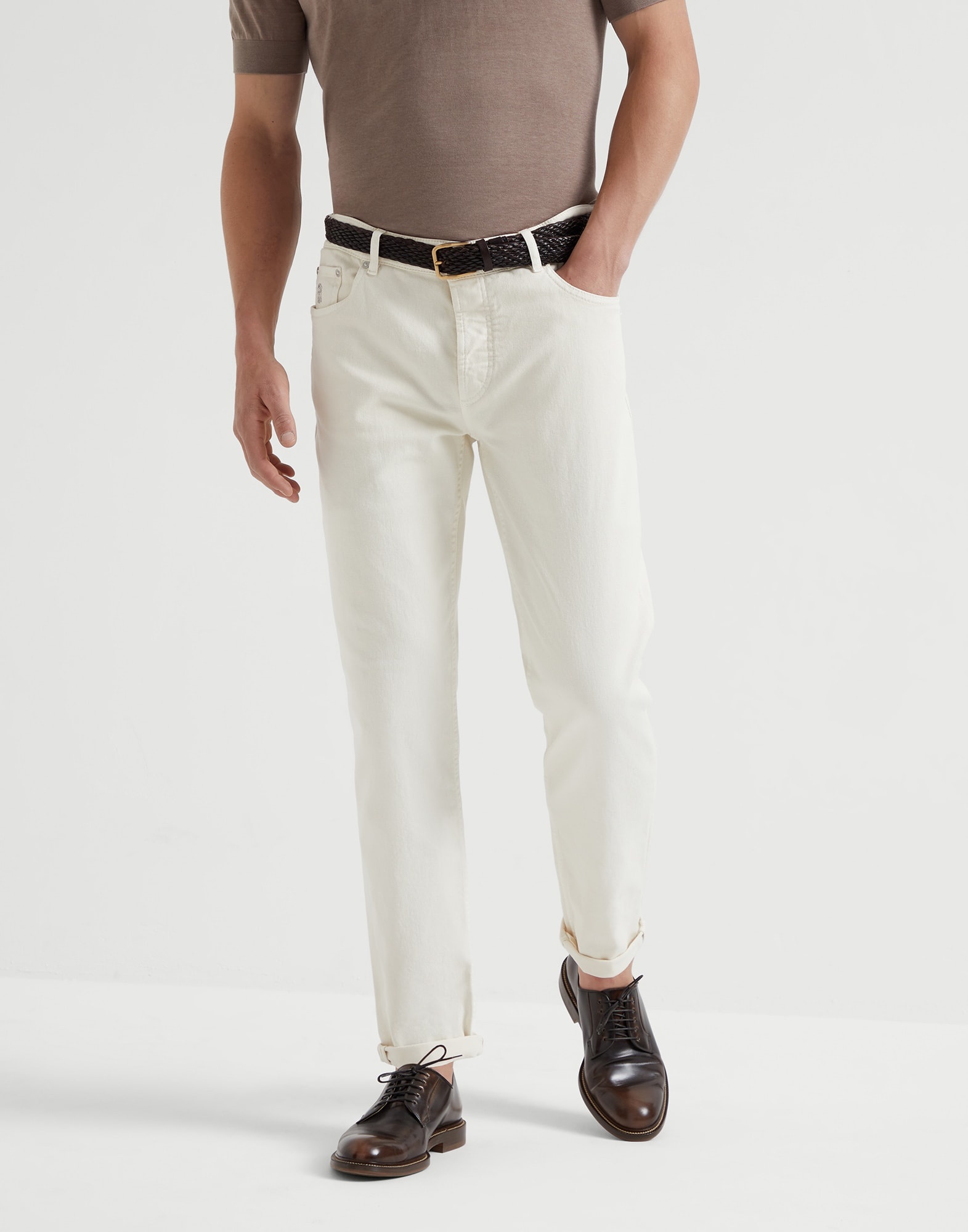 Garment-dyed comfort lightweight denim traditional fit five-pocket trousers