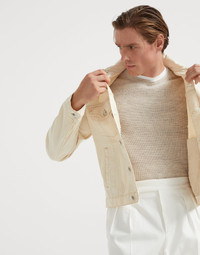 The excellence of Brunello Cucinelli materials enriches the style of the four-pocket jacket, an iconic, sporty style of the male wardrobe. The chest pockets, metal buttons and contrast stitch details are reminiscent of denim styling, to which the worn touch of the garment dyed cotton fabric’s slight color shading is added. MATERIALS The garment-dye finishing gives the color a slightly irregular aspect and creates mild shading along the seams and edges of the garment. A small percentage of spandex helps to make the fabric comfortable to wear. DETAILS Metal button closure Shirt-style collar Upper patch pockets with flap and button Vertical hand pockets Button cuffs Back buttons for fit adjustment 99% COTTON, 1% ELASTANE