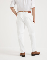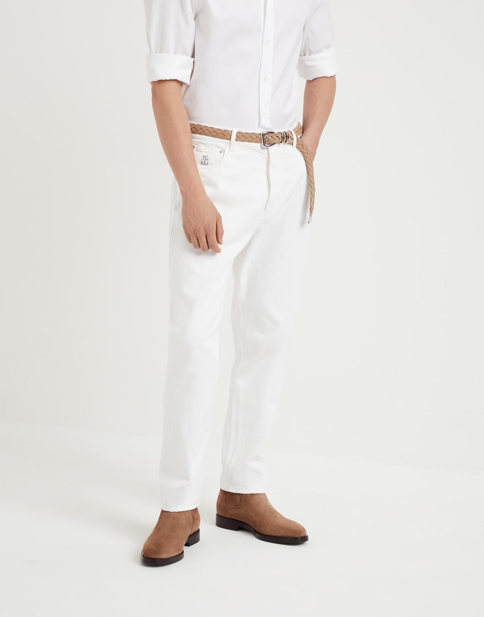 A distinct iconic fit defines these garment-dyed denim five-pocket trousers, a versatile piece for any season. The fabric’s light texture is enriched by its slubbed effect, giving the trousers a timeless, natural feel. The silhouette offers a slightly high-waisted cut, developing evenly down the leg. MATERIALS Slubbed denim is made from a special cotton yarn with an irregular width. The end result is a full texture that weighs just 11.6 oz and a similar appearance to fabrics with rustic fibers, such as linen. DETAILS Zip closure with button Front pockets with watch pocket Back patch pockets Iconic fit: the fit is characterized by slightly high-rise proportions with a regular design along the leg 100% COTTON