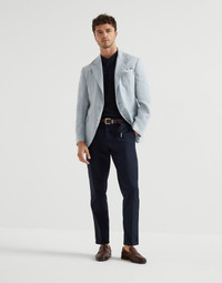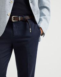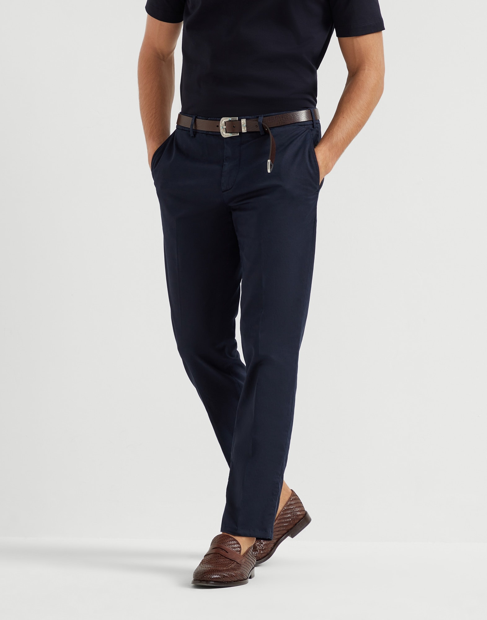 The classic character of the Italian fit trousers is enriched with the excellence of American Pima gabardine, a precious cotton fabric with superior characteristics. The Italian fit remains close to the body, but at the same time, offers slightly softer lines than the more traditional cuts. MATERIALS The American Pima cotton variety offers superior quality in terms of length, luster and strength of the fiber. Furthermore, garment-dyeing creates a particular finish that gives the color a dusty appearance and slight visible shading along the seams. A small percentage of spandex perfects comfort. DETAILS Zip closure with button and inner-buttons Slanted front pockets Back welt pockets with button Lining to knee 17.5 cm (6,89") hem Italian fit: the fit is fitted and balanced, with a regular seat and waist 97% COTTON, 3% ELASTANE