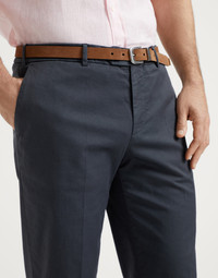 The classic character of the Italian fit trousers is enriched with the excellence of American Pima gabardine, a precious cotton fabric with superior characteristics. The Italian fit remains close to the body, but at the same time, offers slightly softer lines than the more traditional cuts. MATERIALS The American Pima cotton variety offers superior quality in terms of length, luster and strength of the fiber. Furthermore, garment-dyeing creates a particular finish that gives the color a dusty appearance and slight visible shading along the seams. A small percentage of spandex perfects comfort. DETAILS Zip closure with button and inner-buttons Slanted front pockets Back welt pockets with button 17.5 cm hem Italian fit: the fit is fitted and balanced, with a regular seat and waist 97% COTTON, 3% ELASTANE