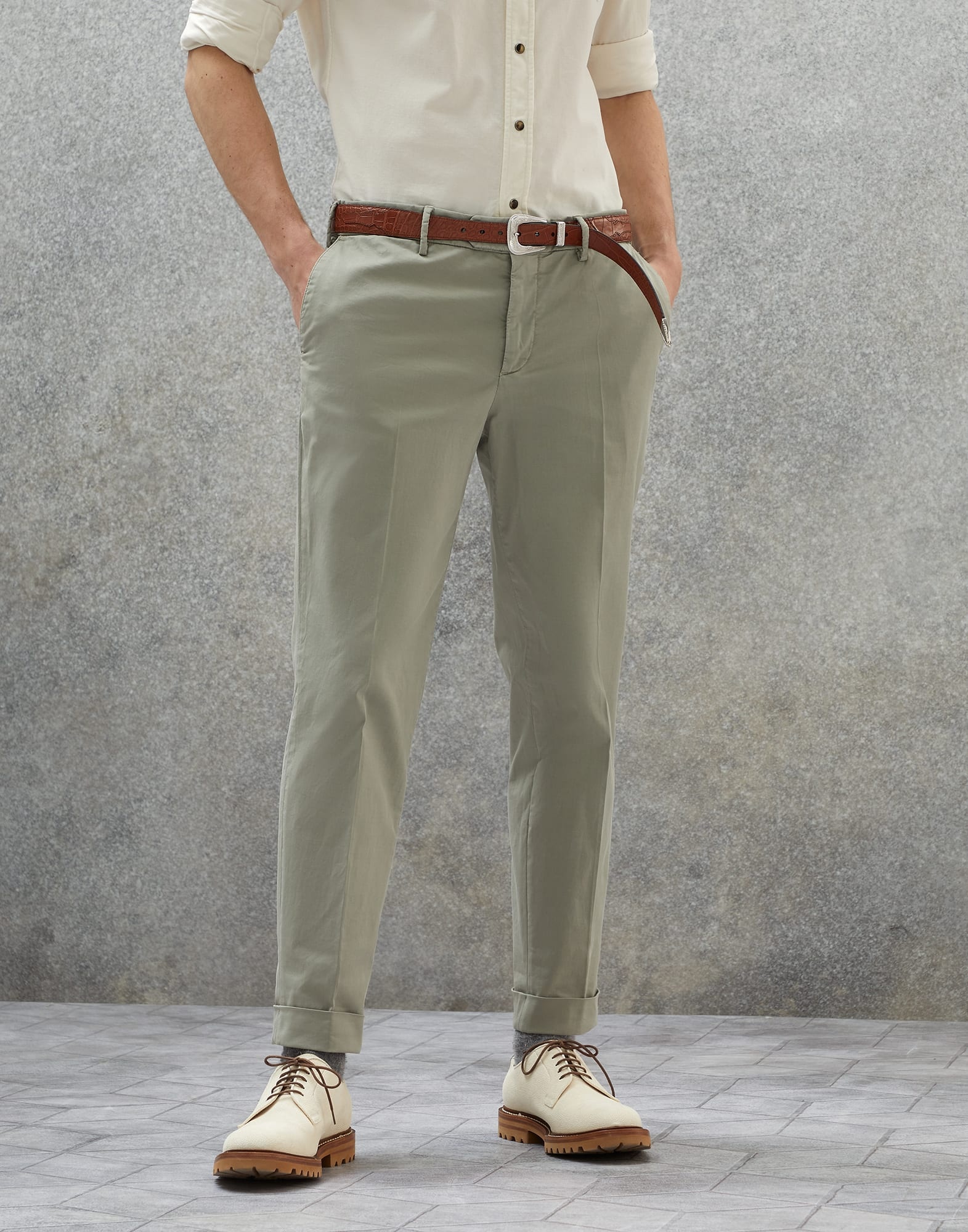 The classic character of the Italian fit trousers is enriched with the excellence of American Pima gabardine, a precious cotton fabric with superior characteristics. The Italian fit remains close to the body, but at the same time, offers slightly softer lines than the more traditional cuts. MATERIALS The American Pima cotton variety offers superior quality in terms of length, luster and strength of the fiber. Furthermore, garment-dyeing creates a particular finish that gives the color a dusty appearance and slight visible shading along the seams. A small percentage of spandex perfects comfort. DETAILS Zip closure with button and inner-buttons Slanted front pockets Back welt pockets with button Lining to knee 17.5 cm hem Italian fit: the fit is fitted and balanced, with a regular seat and waist 97% COTTON, 3% ELASTANE