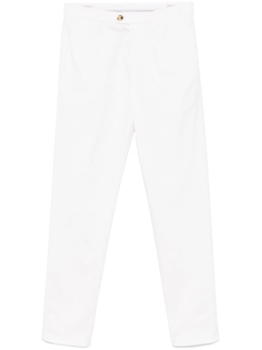 tapered chinos Highlights - White - Concealed front button, hook and zip fastening - Two side inset pockets - Two rear jetted pockets - Belt loops Made in Italy Composition Outer: Cotton 97%, Elastane 3% Lining: Cotton 100% SIZE & FIT Model measurements Height 6 ft 2 in(1.87 m) Bust/Chest 37.79 in(96 cm) Hips 37.79 in(96 cm) Waist 30.31 in(77 cm) FittingInformation Designed for a straight-leg, allowing for an unrestricted and comfortable fit over the leg Made from a midweight stretch fabric, this piece offers elasticity and flexibility when worn