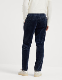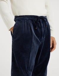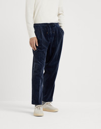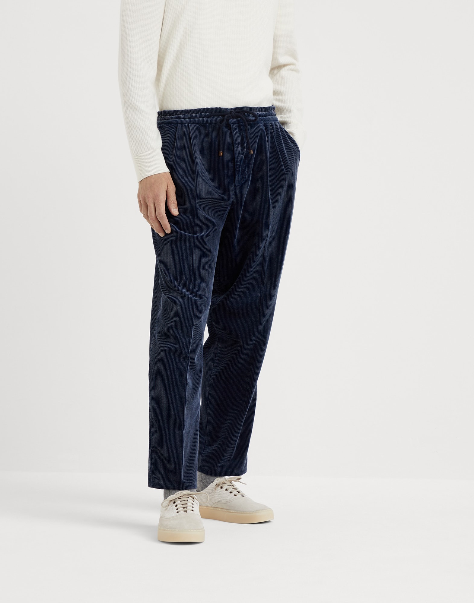 The casual feel of these drawstring trousers is enriched by the excellence of Brunello Cucinelli’s craftsmanship. The sartorial detail of the double pleats creates a harmonious contrast with the corduroy fabric, garment-dyed for a distinct color effect. The modern leisure fit offers soft proportions in the seat and a slight low-rise, while the cut of the leg remains close to the body. MATERIALS Garment dyed pure cotton velvet is delivered as corduroy: the garment’s dye makes it possible to enhance all of the season’s colors to the fullest. DETAILS Zipper closure with metal hook, inner-button and drawstring Double pleat Slanted front pockets Back welt pocket Plain hem Leisure fit: the rise and seat are soft and the proportions of the leg are tapered 100% COTTON