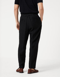 The lightweight texture of linen gabardine enhances the casual style of these trousers with an elegant effect. The drawstring and the double pleat details are combined with a modern leisure fit, offering soft proportions in the seat and a slight low-rise, while the cut of the leg remains close to the body. MATERIALS Linen gabardine is a fresh, lightweight fabric that is ideal to wear in the summer. Garment-dying gives the color a slight muted effect and creates mild fading along the edges and seams of the piece. DETAILS Zipper closure with metal hooks and drawstring Slanted front pockets Back welt pockets Double pleat 18 cm hem Leisure fit: the rise and seat are soft and the proportions of the leg are tapered 100% LINEN