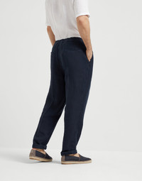 The lightweight texture of linen gabardine enhances the casual style of these trousers with an elegant effect. The drawstring and the double pleat details are combined with a modern leisure fit, offering soft proportions in the seat and a slight low-rise, while the cut of the leg remains close to the body. MATERIALS Linen gabardine is a fresh, lightweight fabric that is ideal to wear in the summer. Garment-dying gives the color a slight muted effect and creates mild fading along the edges and seams of the piece. DETAILS Zipper closure with metal hooks and drawstring Slanted front pockets Back welt pockets Double pleat 18 cm hem Leisure fit: the rise and seat are soft and the proportions of the leg are tapered 100% LINEN
