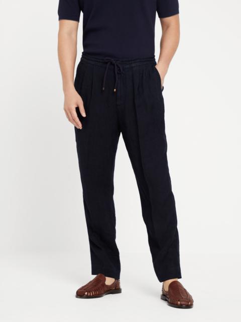The lightweight texture of linen gabardine enhances the casual style of these trousers with an elegant effect. The drawstring and the double pleat details are combined with a modern leisure fit, offering soft proportions in the seat and a slight low-rise, while the cut of the leg remains close to the body. MATERIALS Linen gabardine is a fresh, lightweight fabric that is ideal to wear in the summer. Garment-dying gives the color a slight muted effect and creates mild fading along the edges and seams of the piece. DETAILS Zipper closure with metal hooks and drawstring Slanted front pockets Back welt pockets Double pleat 18 cm hem Leisure fit: the rise and seat are soft and the proportions of the leg are tapered 100% LINEN