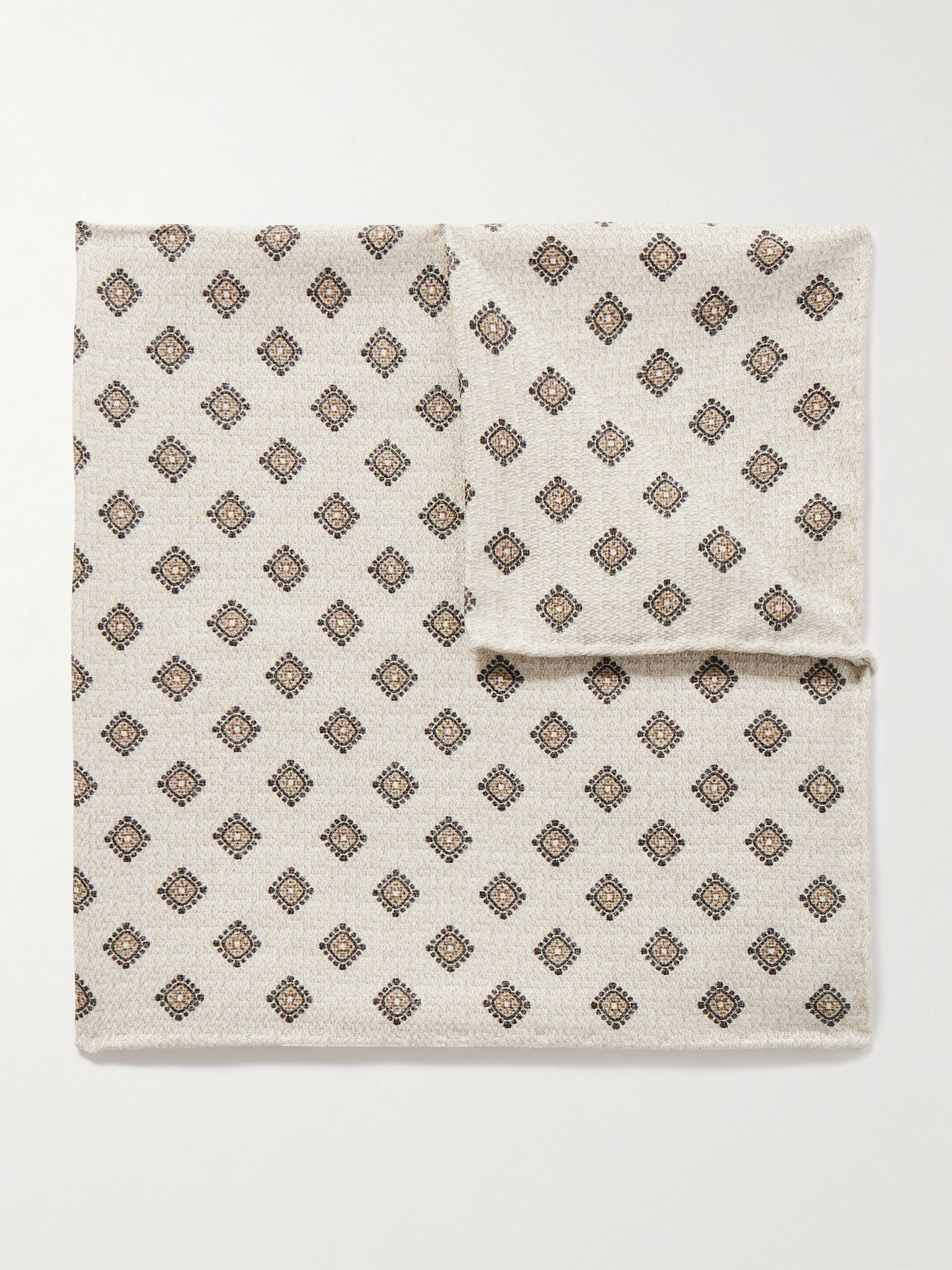 The colours in a pocket square should pick up, but not match, your suit or tie. Brunello Cucinelli's style comes in tonal-beige and navy, so it'll go with most anything. It's been made in Solomeo, Italy from pure silk and is patterned with a classic monogram. Details & Care - Tonal-beige and navy silk-jacquard - 100% silk - Dry clean