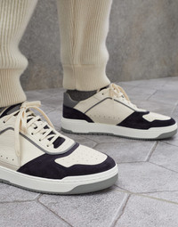 A new sporty style enriches the Brunello Cucinelli sneaker collection. Inspired by iconic Basketball models, these sneakers combine typical grained calfskin with washed suede trim for a refined color and texture contrast. Together with the heraldic Solomeo logo, the lightweight two-tone rubber outsole is personalized on the bottom with a chevron pattern. MATERIALS The calfskin is characterized by an even, grained texture that enriches the colors of the season with a rich, full effect. DETAILS Flat fabric laces Detachable insole Leather lining Rubber outsole REAL LEATHER