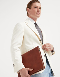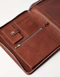 Functional and elegant, this document holder showcases refined grained calfskin leather, characterized by delicate color shading and a semi-polished finish. The practical zip-around closure protects the interior, which is equipped with numerous sections to better organize the workday: compartments for paperwork, credit and business card slots, a zipper pocket and two pen holders. MATERIALS Manufacturing of the grained calfskin enriches the texture with slightly uneven coloring, giving the look of the leather a “vintage” flavor. On the inside, the accessory is lined in water-resistant fabric to protect its contents from the light contact with liquids. DETAILS Zip closure Outside zipper pocket Cotton lining Internal compartment with snap Internal compartment with zipper 2 open internal compartments Pen holder 7 slots for cards and business cards All metal parts are Nickel-free Accessory is approx. 33.5 cm (13,19") long, 30 cm (11,81") high and 5 cm (1,97") wide REAL LEATHER