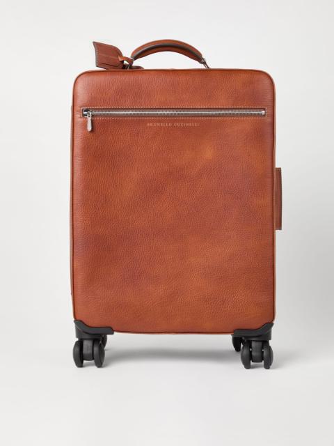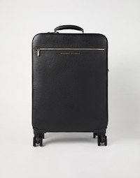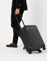 Refined Brunello Cucinelli materials enrich the style of the trolley which adds an elegant and functional touch to trips. The accessory uses the texture of the grained calfskin and is equipped with two large exterior practical pockets: one in the front with a zipper closure and one in the back with a snap. A zipper closure protects the interior which has a large side zipper pocket and a spacious main compartment with an adjustable belt to secure garments while travelling. The adjustable-height telescoping handle and the double handle on the long side complete the accessory. MATERIALS Manufacturing of the grained calfskin enriches the texture with slightly uneven coloring, giving the look of the leather a “vintage” flavor. On the inside, the accessory is lined in water-resistant fabric to protect its contents from the light contact with liquids. DETAILS Two-way zip closure Handle Outside zipper pocket Outside pocket with snaps Water-resistant fabric lining Large interior compartment equipped with double leather belt and Velcro Swivel wheels Rigid, stowable handle All metal parts are Nickel-free Removable name tag Accessory is approx. 42 cm (16.54") long, 65 cm (25.59") high and 24 cm (9.45") wide REAL LEATHER