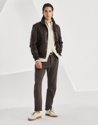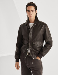 The excellence of Brunello Cucinelli materials enhances the classic, traditional feel of this aviator-style jacket. The outerwear is made of carefully selected leather, defined with a distinct, slightly irregular natural grain that highlights its unique character. The regular fit is characterized by iconic elements such as the shirt collar and ribbed trim. MATERIALS The leather showcases a natural grain and is characterized by slight irregularities that enhance the beauty of the hide. The cupro lining provides added comfort. DETAILS Double closure with zip and snaps Shirt-style collar Patch hand pockets with flap and button Rib knit cuffs and bottom band Two interior pockets with button and pen holder Lined REAL LEATHER