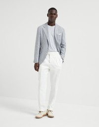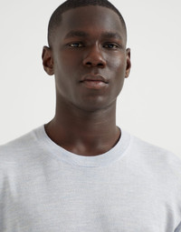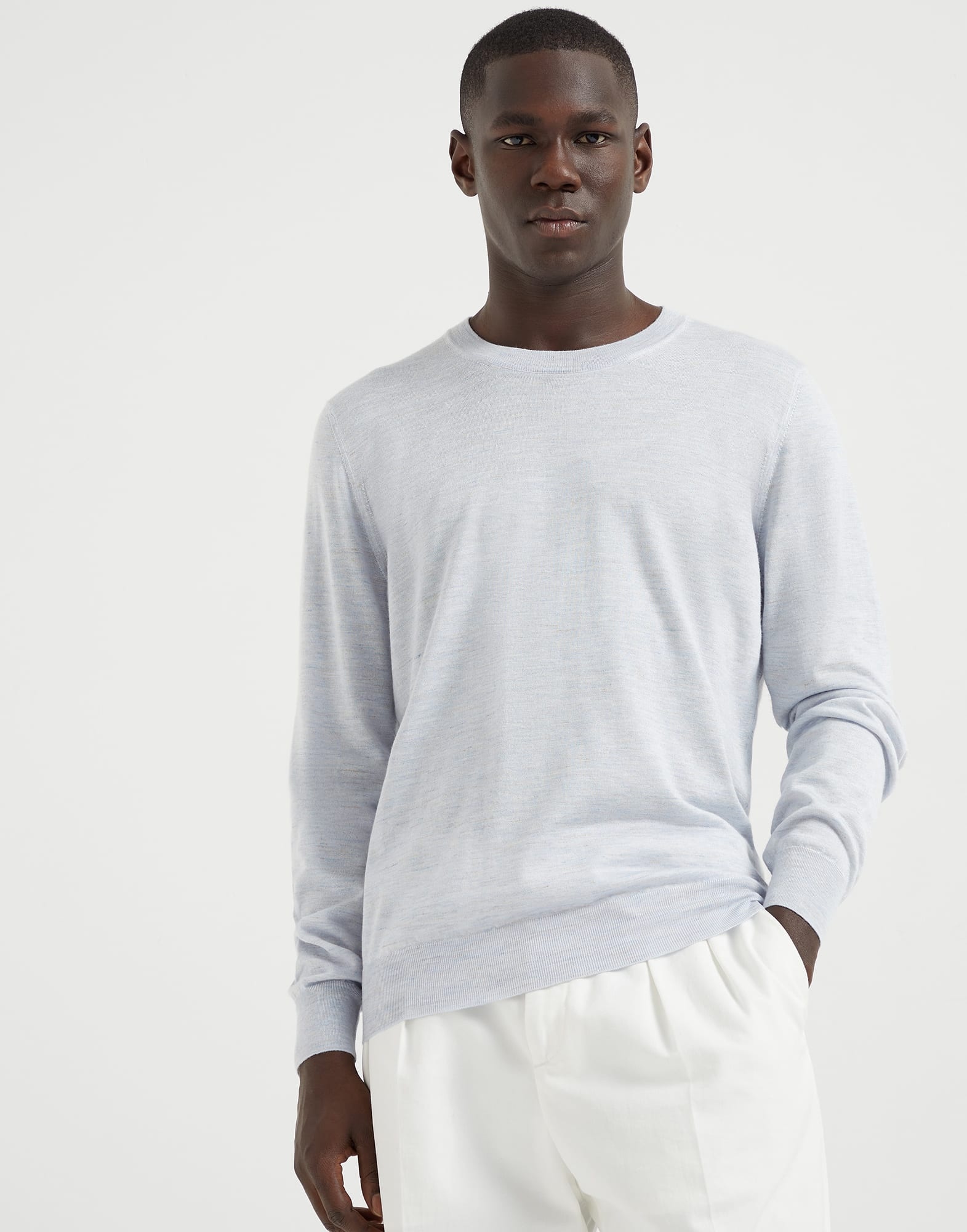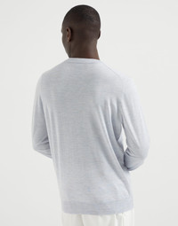 The excellence of Brunello Cucinelli yarns enhances the essential lines of this long sleeve sweater, a must-have menswear piece. For the first time, the lightweight knitted garment blends cashmere, silk and linen fibers in a singe yarn, enriching the season's colors with a distinct irregular texture. With a comfortable fit, the sweater is particularly suitable for milder days. MATERIALS Single-ply knitting of the cashmere and silk yarn brings out the qualities of the natural fibers and provides lightness and comfort. The addition of linen enriches the season’s colors with the material’s characteristic irregular texture. The garment has a balanced weight that is particularly suited for the beginning of the season. DETAILS Crew-neck in rib knit Regular shoulder Rib knit cuffs and bottom band Plain stitch 42% CASHMERE, 36% SILK, 22% LINEN