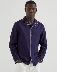 Lightness and retro inspiration define the style of this easy fit long sleeve shirt thanks to the unmistakable detail of the camp collar. The soft texture of the pure cotton honeycomb fabric stands out in contrast with the darker edging. Defined by its regular, rather straight lines, the easy fit has a slightly shorter length than other fits, making it perfect to wear over trousers for a casual look. MATERIALS Manufacturing of the pure cotton yarn enhances the qualities of the natural fibers and makes the garment lightweight and comfortable to wear. DETAILS Plain front closure with mother of pearl buttons Camp collar Cuffs have one mother of pearl button Easy fit 100% COTTON