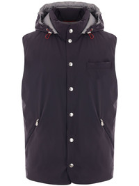 hooded down gilet Highlights - Navy blue/grey - Down-feather filling - Detachable drawstring hood - High neck - Front press-stud fastening - Sleeveless - Side zip-fastening pocket - Straight hem Made in Italy Composition Lining: Nylon 100%, Goose Down 90%, Goose Feather 10% Outer: Polyamide 87%, Elastane 13% Washing instructions Read Manufacturer Guidelines
