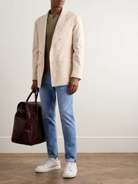 Brunello Cucinelli's 'Iconic' jeans are accurately named – with the slim fit and medium blue wash, they have all the makings of a modern classic. They're cut from denim, blended with a little stretch and finished with embroidered logos. Size & Fit - Fits true to size. Take your normal size - Slim-straight leg, mid-rise style - Mid-weight, slightly stretchy fabric - Model is shown wearing an IT 46 - Model measures: waist size 30, height 6'1"/ 185cm Details & Care - Blue stretch-denim - Button fastenings - 98% cotton, 2% elastane; trim: 100% leather (Calf) - Machine wash