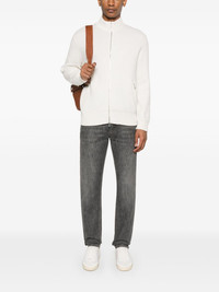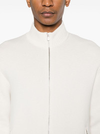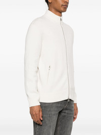 ribbed-knit cardigan Highlights - White - Virgin wool blend - Ribbed knit - Front two-way zip fastening - High neck - Drop shoulder - Long sleeves - Two side zip-fastening pockets - Straight hem Made in Italy Composition Virgin Wool 57%, Cashmere 29%, Silk 10%, Polyamide 3%, Elastane 1% SIZE & FIT Model measurements Height 6 ft 2 in(1.87 m) Bust/Chest 36.22 in(92 cm) Hips 37 in(94 cm) Waist 27.95 in(71 cm) FittingInformation Designed for a relaxed fit, this piece allows for comfort and movement when worn The ribbed hem offers a close, comfortable fit Made with a midweight knit, this piece offers some stretch