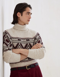 Retro inspiration is paired with the selection of the finest raw materials and artisanal workmanship in this geometric jacquard turtleneck sweater in virgin wool, silk, and cashmere. Jacquard loom work creates a geometric pattern with a classic allure, enriched with the irregular colors of the mouline yarn. The fit offers regular proportions and warm, cozy comfort. MATERIALS Jacquard loom work is paired with the distinctive mottled effect of mouline yarn to create refined retro-inspired geometric patterns that enrich the substantial, soft texture of the virgin wool, silk and cashmere sweater. DETAILS High turned-down collar Raglan sleeve Rib knit cuffs and bottom band Special workmanship 70% VIRGIN WOOL, 22% SILK, 8% CASHMERE