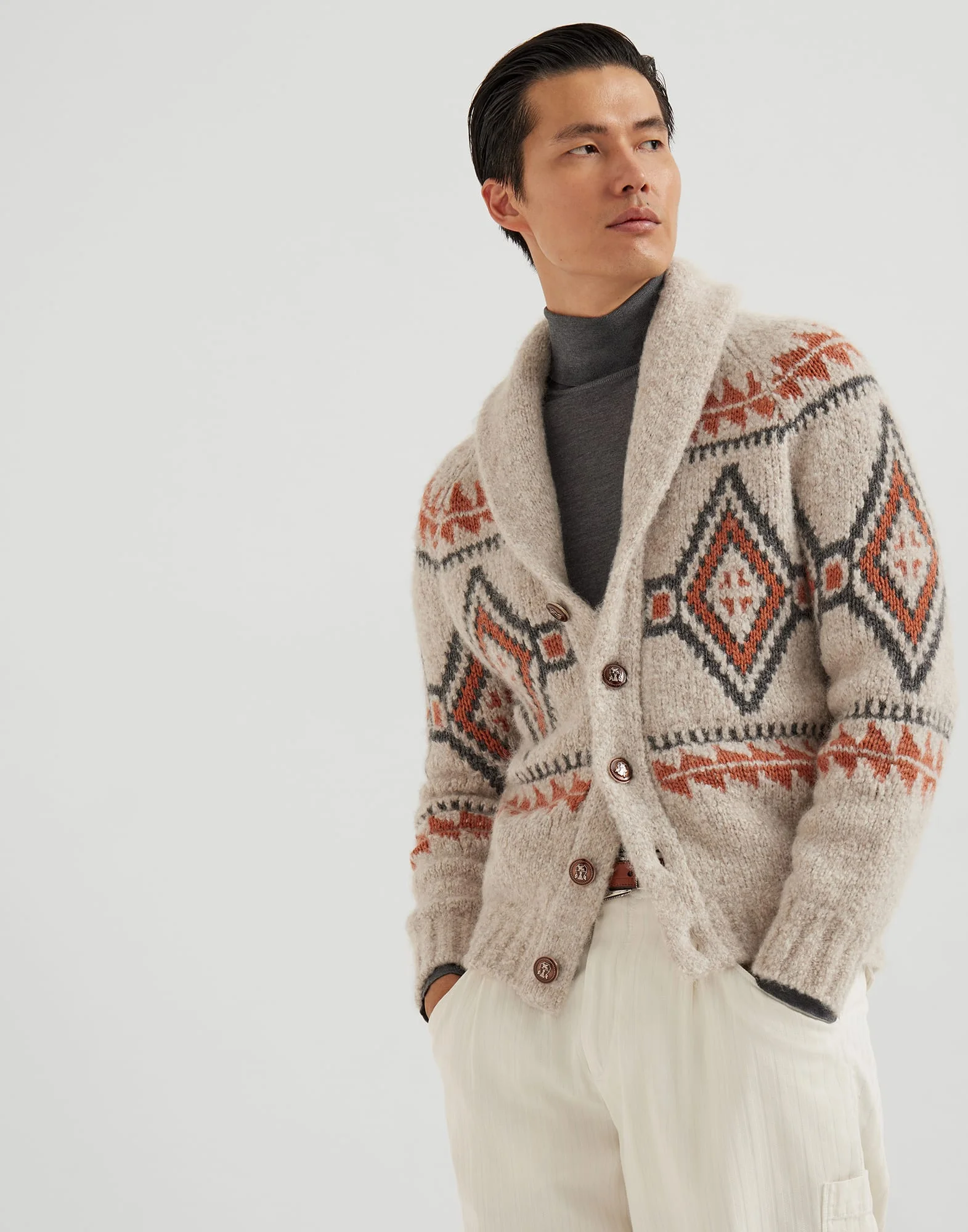 Intricate artisanal workmanship elevates the relaxed, casual feel of this geometric jacquard cardigan, which blends alpaca, virgin wool and cashmere in a yarn with unique characteristics. The natural fibers come together in a warm, cozy knit, which enriches the retro-inspired geometric motif with a slightly irregular, powdery effect, crafted on a jacquard loom. The silhouette offers regular proportions, completed by the shawl collar and metal buttons. MATERIALS Alpaca yarn, characterized by smooth, fine fibers, is very soft, warm and voluminous. The combination with the natural virgin wool and cashmere fibers creates a compact, even look. The natural composition of the yarn requires the presence of a small percentage of technical fiber which ensures the garment’s structure. DETAILS Resin buttons closure Shawl collar Raglan sleeve Rib knit cuffs and bottom band Jacquard-knit 78% ALPACA, 9% NYLON, 8% VIRGIN WOOL, 4% CASHMERE, 1% SILK