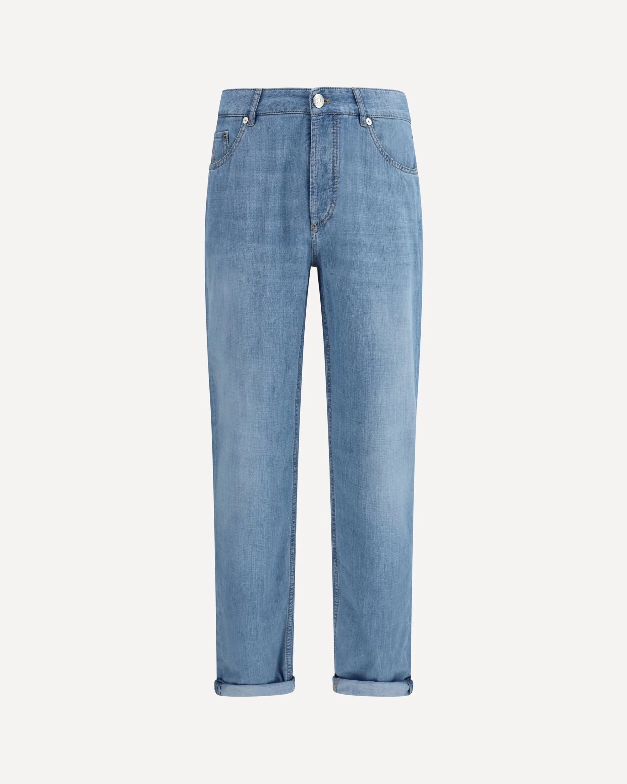 The Jeans in cotton with distressed effect by Brunello Cucinelli reinterpret denim with a contemporary textured aesthetic. Defined by scratch-effect detailing and a lived-in finish, they feature button fastening, three side pockets and two patch back pockets. An embroidered emblem and leather logo patch complete the design with distinctive refined touches. DETAILS - Sku: ME645D3210_C1470 - Season: SS26 - Fit: Regular - Composition: GENERAL 100% Cotton - MADE IN ITALY