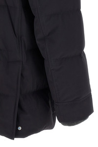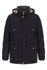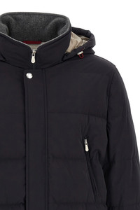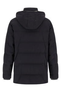 cod. MM4911823CFV83 Quilted tech fabric jacket with water-repellent goose down padding with ribbed cotton knit inserts, adjustable and removable hood, standing collar, front zip and snap button closure, pockets, long sleeves with elastic cuffs, adjustable slits with back snap buttons. Color: Blue Size & Fit: true to size fit Composition: 87% polyamide, 13% elastane Made in: Italy