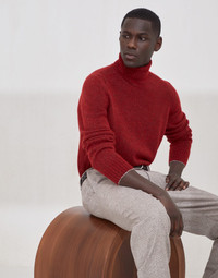 The careful selection of raw materials enriches this alpaca, wool, silk and cotton turtleneck sweater with an unmistakable charm. The artisanal workmanship enhances the natural qualities of the fibers in an airy, flecked yarn with a distinctive mottled and irregular coloration, creating a warm and cozy garment with balanced proportions. MATERIALS Soft and airy, the alpaca fibers add lightness to the wool, silk and cotton yarn, enhancing the natural qualities of the raw materials while ensuring warmth and comfort. The distinctive mottled effect of the flecked yarn enhances the season’s colors. DETAILS High turned-down collar Regular shoulder Rib knit cuffs and bottom band Plain stitch 36% ALPACA, 25% NYLON, 13% WOOL, 13% SILK, 10% COTTON, 3% VISCOSE