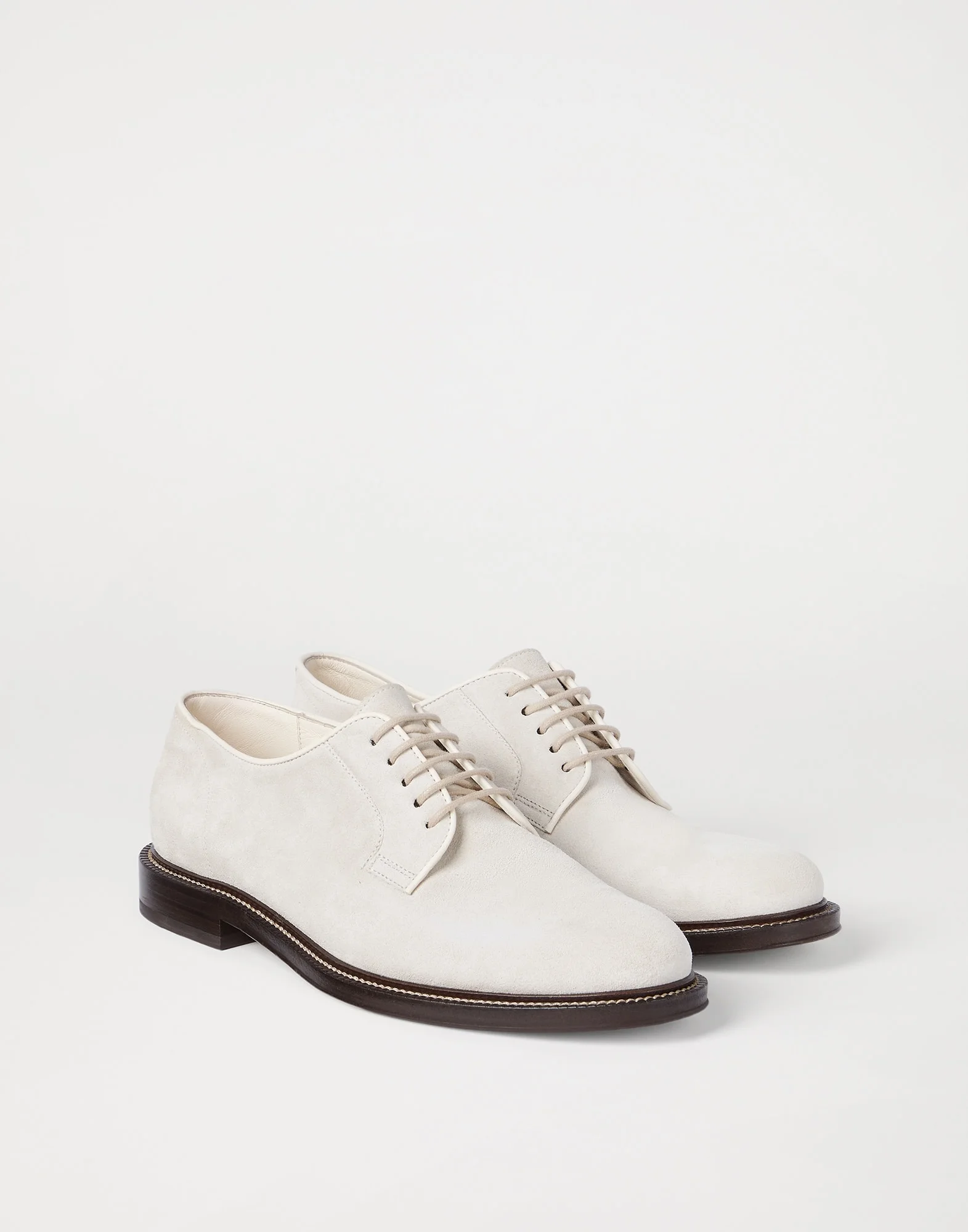 The elegance of a classic silhouette is paired with refined materials and workmanship in these new reversed calfskin Derbies. The particular texture of this leather is smooth, velvety, and slightly shimmering, adding intensity and depth to the season’s colors. The fit is comfortable and flexible thanks in part to the TPU outsole. MATERIALS Reversed calfskin is a leather produced in France that displays the velvety and slightly shimmering look of suede on the exterior, while the reverse side is characterized by a light natural grain. The result is lightweight, flexible and unlined footwear, providing ideal comfort when worn. DETAILS Round waxed fabric laces Extra round waxed fabric laces Leather lining REAL LEATHER