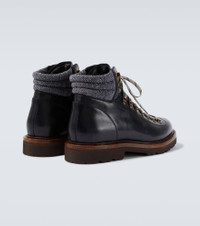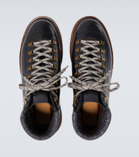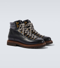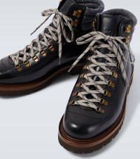 These boots from Brunello Cucinelli feature a mountain-like design that completes casual looks with refinement. The pair is crafted from leather and finished with sporty details, including soft lining, metal D-rings, and two-tone laces. Product Details - Upper: leather, fabric - Lining: shearling - Sole: shearling insole, rubber sole - Toe shape: round toe - Made in Italy - Includes: dust bag, shoe box - Designer color name: Cwx73 - Item color: black - Item number: P01056148 Size & Fit - Fits slightly small to size - we recommend trying a half size larger - European sizes
