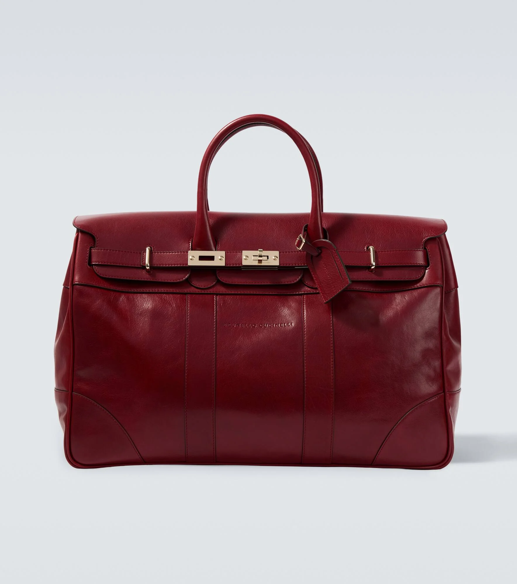 Brunello Cucinelli's designs are created in Solomeo, a medieval hamlet whose art and traditions are woven into the house's every fiber. This tote bag is crafted from supple dark red-hued leather and boasts two tubular top handles and a detachable address tag. Product Details - Material: leather - Lining: fabric, leather - Made in Italy - Color: red - Designer color name: Rosso Antico - Hardware color: gold - Closure: turn-lock fastening - Top handles - Internal details: internal zipped pocket - Detachable address tag - Includes: dust bag - Protective feet - Item number: P01138550 Size & Fit - Height 35,5cm-14" - Width 52,5cm-20.5" - Depth 20cm-8" - Length of handles 50cm-19.5"
