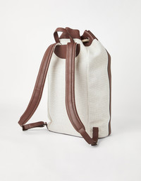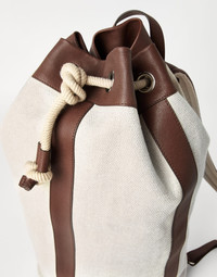 The functional, relaxed character of this Leisure drawstring bag is enhanced by the selection of the main materials. Treated with a water-resistant finish, the cotton and linen fabric has a distinct, irregular hand, a nice contrast with the softness of the polished buffalo leather. Large and roomy, it is enriched with nautical-inspired details such as the rope drawstring. MATERIALS The canvas is made of a linen and cotton blend and is enriched with a special finish that makes it water-resistant, while at the same time enhancing the yarn’s natural irregularity. The buffalo details create an interesting contrast thanks to the refined character of this versatile and resistant leather’s large grain. The accessory is completed with the water-resistant fabric lining. DETAILS Drawstring closure Handle Water-resistant fabric lining Open internal compartment Internal pocket with zip closure All metal parts are Nickel-free Accessory is approx. 33 cm (12.99") long, 54 cm (21.26") high, and 23 cm (9.06") wide 80% LINEN, 10% VISCOSE, 6% POLYESTER, 4% COTTON
