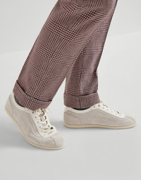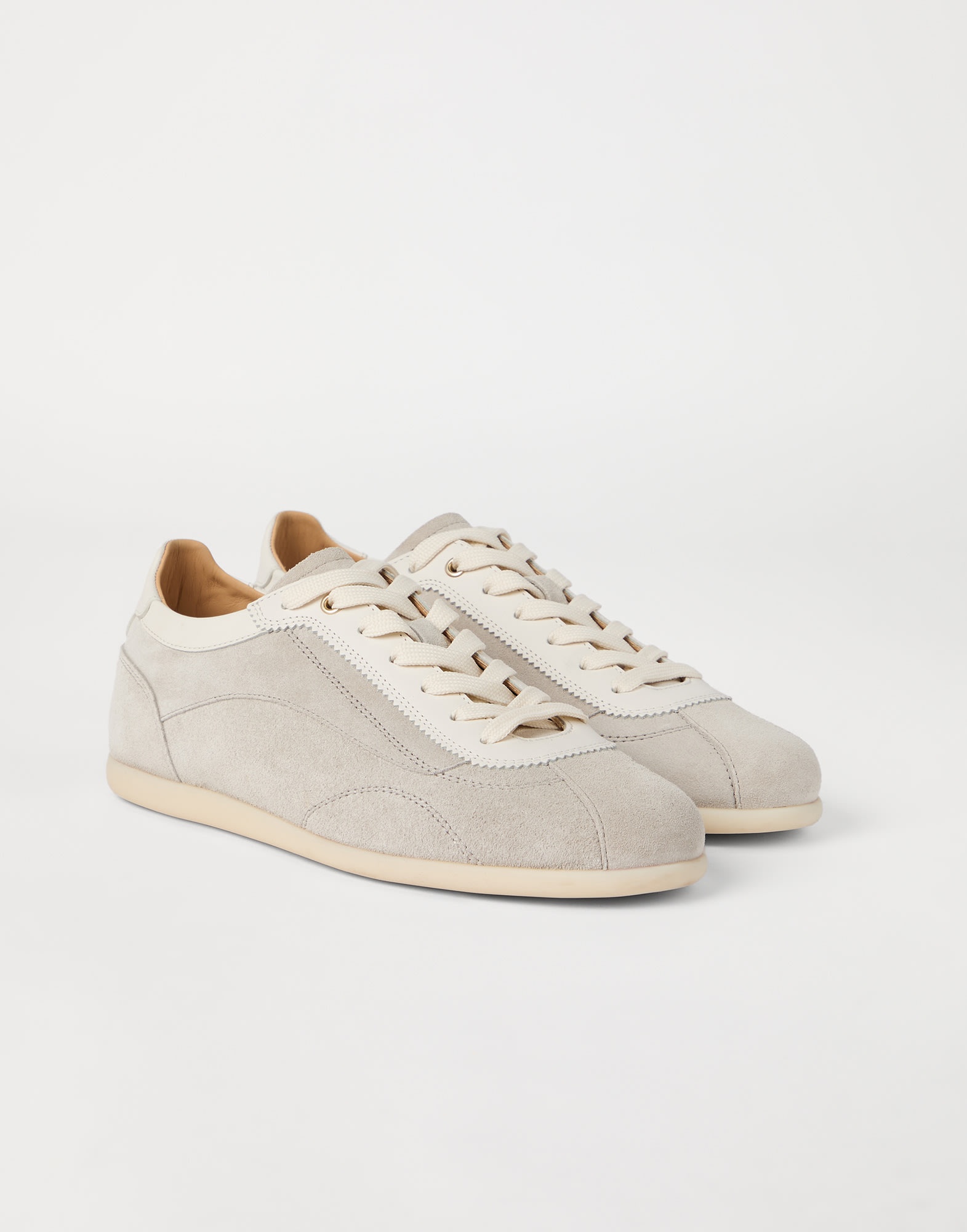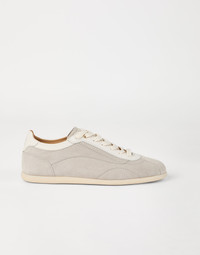 Enhanced by the excellence of Brunello Cucinelli materials and workmanship, these washed suede sneakers combine vintage inspiration in their slim, tapered silhouette. The velvety upper is enriched with slightly irregular color effects and is completed by the particularly thin rubber outsole, which guarantees lightness and comfort. MATERIALS Manufacturing of the refined washed suede involves hand-buffing that enriches the velvety texture with slightly irregular coloring. An ultra lightweight rubber bottom provides added comfort. DETAILS Flat cotton laces Leather lining Slim rubber bottom REAL LEATHER