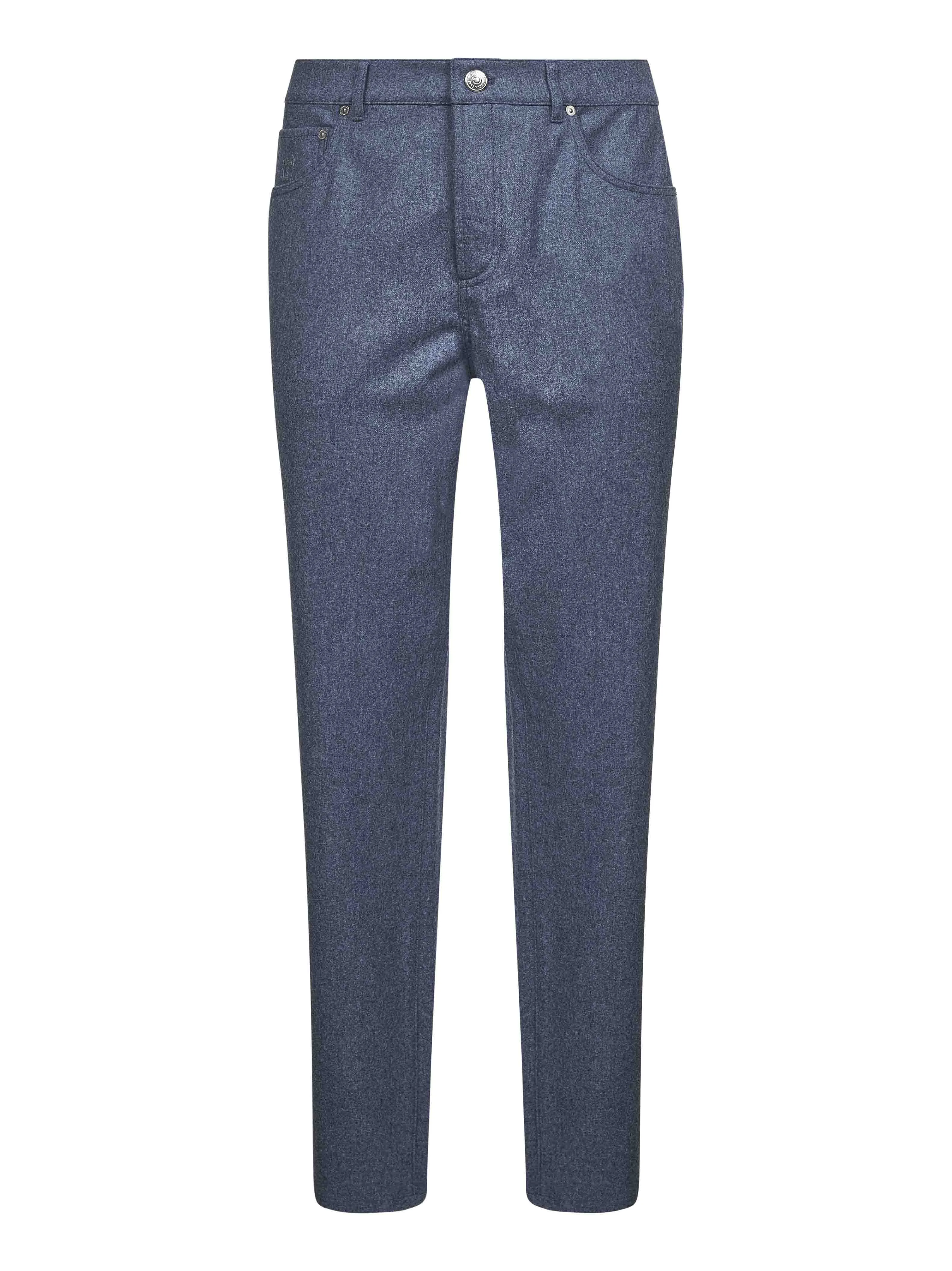 - Button fly closure, metal logo button - Regular waist with belt loops - Five-pocket model - Tone-on-tone solomeo crest embroidered at coin pocket; embossed logo patch at back waistband - Tapered leg - Light blue color - 100% virgin wool - Made in italy Wool or fine animal hair: Virgin Wool100 % Made in: ITALIA Season: A25 M038PF1010-C530