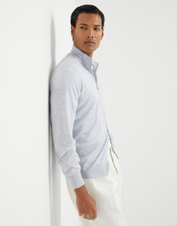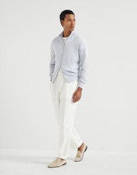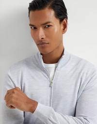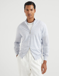 The excellence of Brunello Cucinelli yarns enhances the casual feel of this turtleneck cardigan, a must-have menswear piece. For the first time, the lightweight knitted garment blends cashmere, silk and linen fibers in a singe yarn, enriching the season's colors with a distinct irregular texture. Thanks to the zipper closure, the sweater is comfortable and particularly suitable for milder days. MATERIALS Single-ply knitting of the cashmere and silk yarn brings out the qualities of the natural fibers and provides lightness and comfort. The addition of linen enriches the season’s colors with the material’s characteristic irregular texture. The garment has a balanced weight that is particularly suited for the beginning of the season. DETAILS Two-way zip closure High collar Rib knit cuffs and bottom band Plain stitch 42% CASHMERE, 36% SILK, 22% LINEN