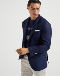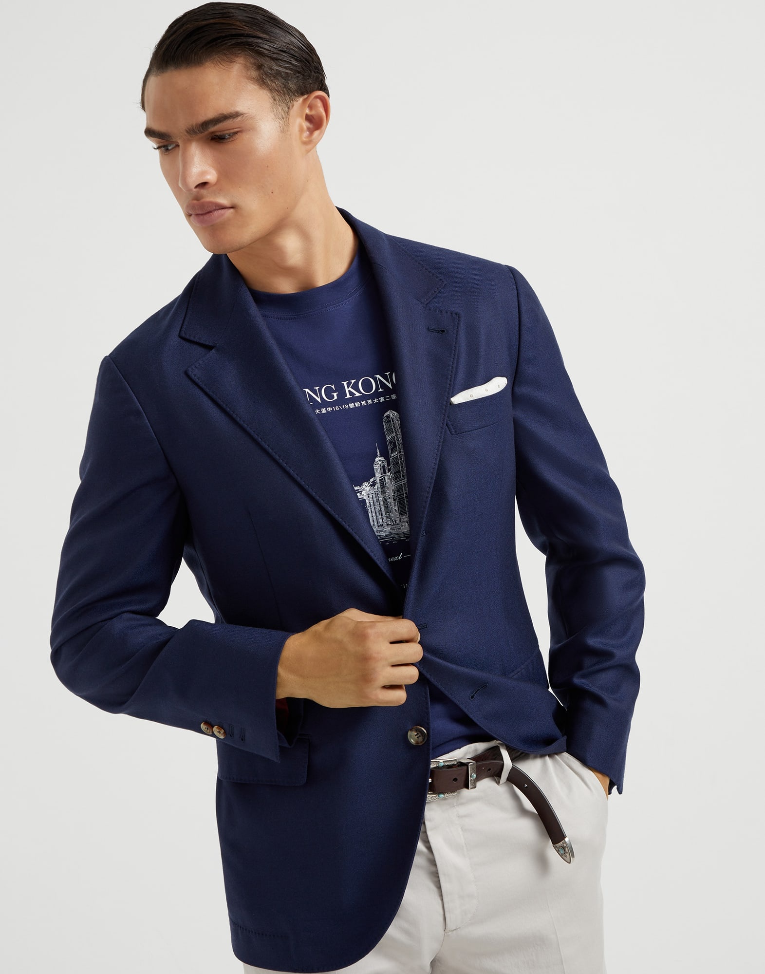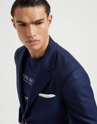 The essential, versatile silhouette of this unconstructed blazer creates a delicate balance between tailored inspiration and a contemporary feel. Extremely lightweight and comfortable, the cashmere twill elevates the garment with the natural properties of the noble fiber. The “Solomeo Shoulder”, named after the hamlet where the company is located, characterizes the Brunello Cucinelli blazer with signature proportions. The tapered and pronounced cut of the shoulder enhances the male physique without the need for padding. MATERIALS The pure cashmere twill is defined by its soft, smooth hand and the fabric’s extreme lightness, achieved with the careful selection of the finest fibers. The cupro half-lining provides added comfort. DETAILS 3-roll-2 closure with horn buttons Notched lapel Welt pockets with flap, ticket pocket and chest pocket Cuffs have four horn buttons and functional buttonholes Double back vent Two interior pockets with button closure and pen holder Cupro half lining Drop 7 100% CASHMERE