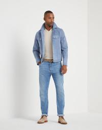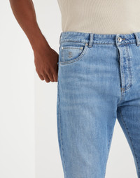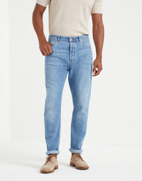 Refined 9.5 oz Japanese denim enriches the timeless style of the five-pocket trousers, an essential piece of the male wardrobe. A leisure fit offers comfortable and slightly soft proportions in the seat and remains close to the body down the leg. MATERIALS The pure cotton denim is characterized by a balanced weight that makes this garment comfortable to wear, particularly in warmer weather. DETAILS Metal button closure Front pockets with watch pocket Back patch pockets 18 cm hem Leisure fit: the rise and seat are soft and the proportions of the leg are tapered 100% COTTON