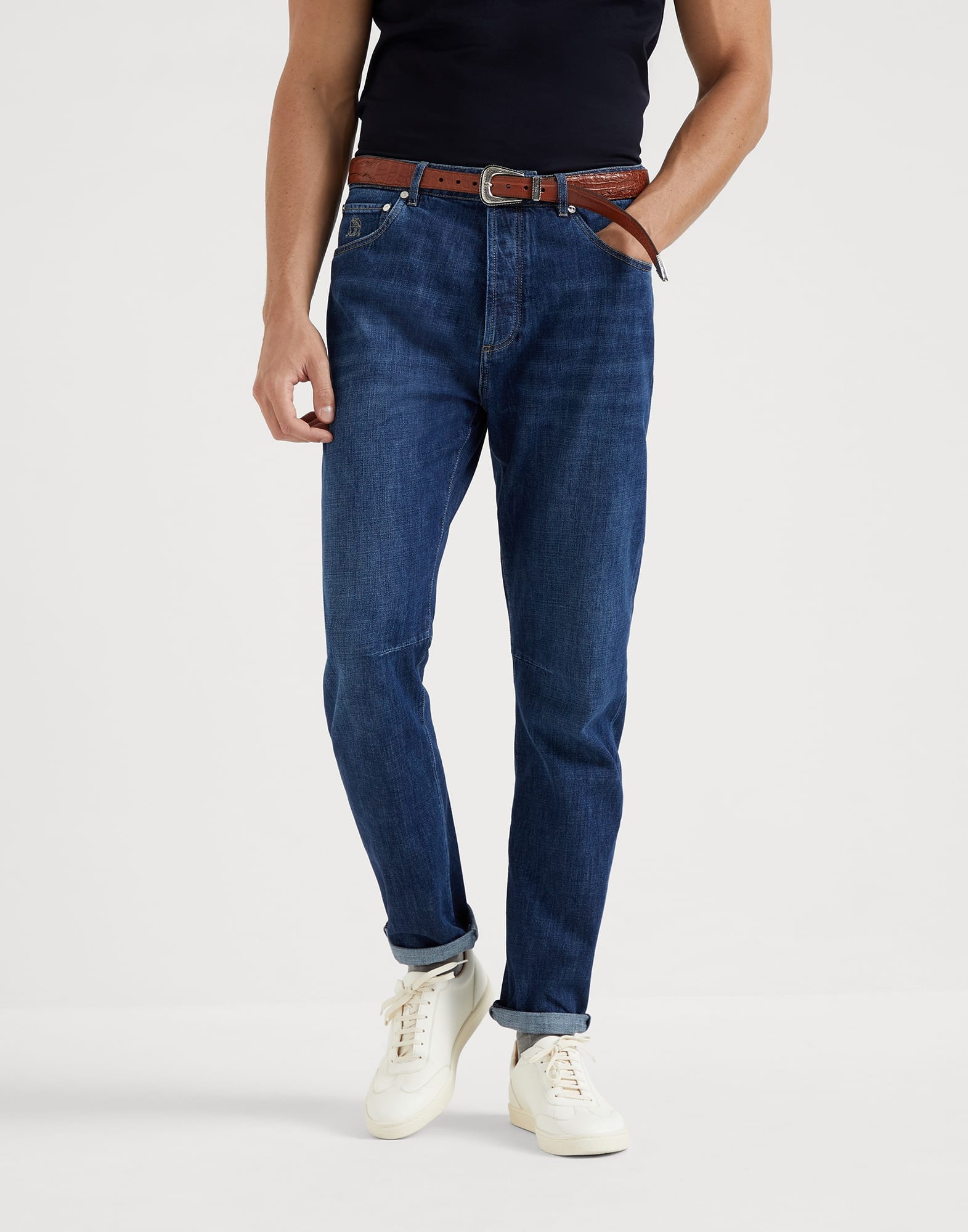 Refined 9.5 oz Japanese denim enriches the timeless style of the five-pocket trousers, an essential piece of the male wardrobe. A leisure fit offers comfortable and slightly soft proportions in the seat and remains close to the body down the leg. MATERIALS The pure cotton denim is characterized by a balanced weight that makes this garment comfortable to wear, particularly in warmer weather. DETAILS Metal button closure Front pockets with watch pocket Back patch pockets 18 cm (7,09") hem Leisure fit: the rise and seat are soft and the proportions of the leg are tapered 100% COTTON