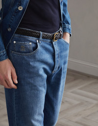 Fine Japanese 9.5oz denim enriches the essential style of the five-pocket trousers, a year-round style of the male wardrobe. The lightweight pure cotton fabric is combined with the traditional fit which expresses the most classic Brunello Cucinelli flavor: form-fitting lines to the body, designed to highlight the male physique. MATERIALS The pure cotton denim is characterized by a balanced weight that makes this garment comfortable to wear, particularly in warmer weather. DETAILS Zip closure with button Front pockets with watch pocket Back patch pockets Traditional fit: the fit is characterized by regular proportions in the seat and straight lines down the leg 100% COTTON