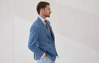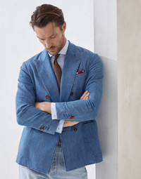 The innovative use of materials updates the classic codes of tailored menswear in this lightweight old denim deconstructed blazer, featuring a one-and-a-half breasted closure and patch pockets. The pure cotton fabric is characterized by a special dyeing process that gives the intense color an irregular effect. The “Solomeo Shoulder”, named after the hamlet where the company is located, characterizes the Brunello Cucinelli blazer with signature proportions. The tapered and pronounced cut of the shoulder enhances the male physique without the need for padding. MATERIALS A garment-dye finishing gives the color a slightly uneven look, particularly along the edges and seams of the garment. DETAILS 6 horn button closure Peak lapel Patch pockets, ticket pocket and chest pocket Cuffs have four horn buttons and functional buttonholes Cupro half lining Two interior pockets with button closure and pen holder Double back vent Drop 7 100% COTTON