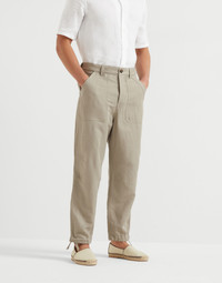 The contemporary spirit of these relaxed fit cotton and linen drill trousers is expressed through the balance of fine yarns and sportswear-inspired details. The soft proportions feature wide lines in the hips that run comfortably down the leg. The patch pockets, drawstring waist and adjustable grosgrain cuffs enrich the design’s informal feel with functional elements. MATERIALS The sporty feel of drill is delivered in a cotton and linen version with a compact yet lightweight texture that showcases the classic diagonal twill weave. The linen fibers enhance the fabric with a slightly mottled effect, accentuating its casual, versatile nature. DETAILS Button closure Drawstring Slanted front pockets Back patch pockets with buttons Drawstring hem Relaxed fit: the proportions are quite wide in the hips and comfortable along the thigh, tapering slightly from the knee to the ankle 56% LINEN, 44% COTTON