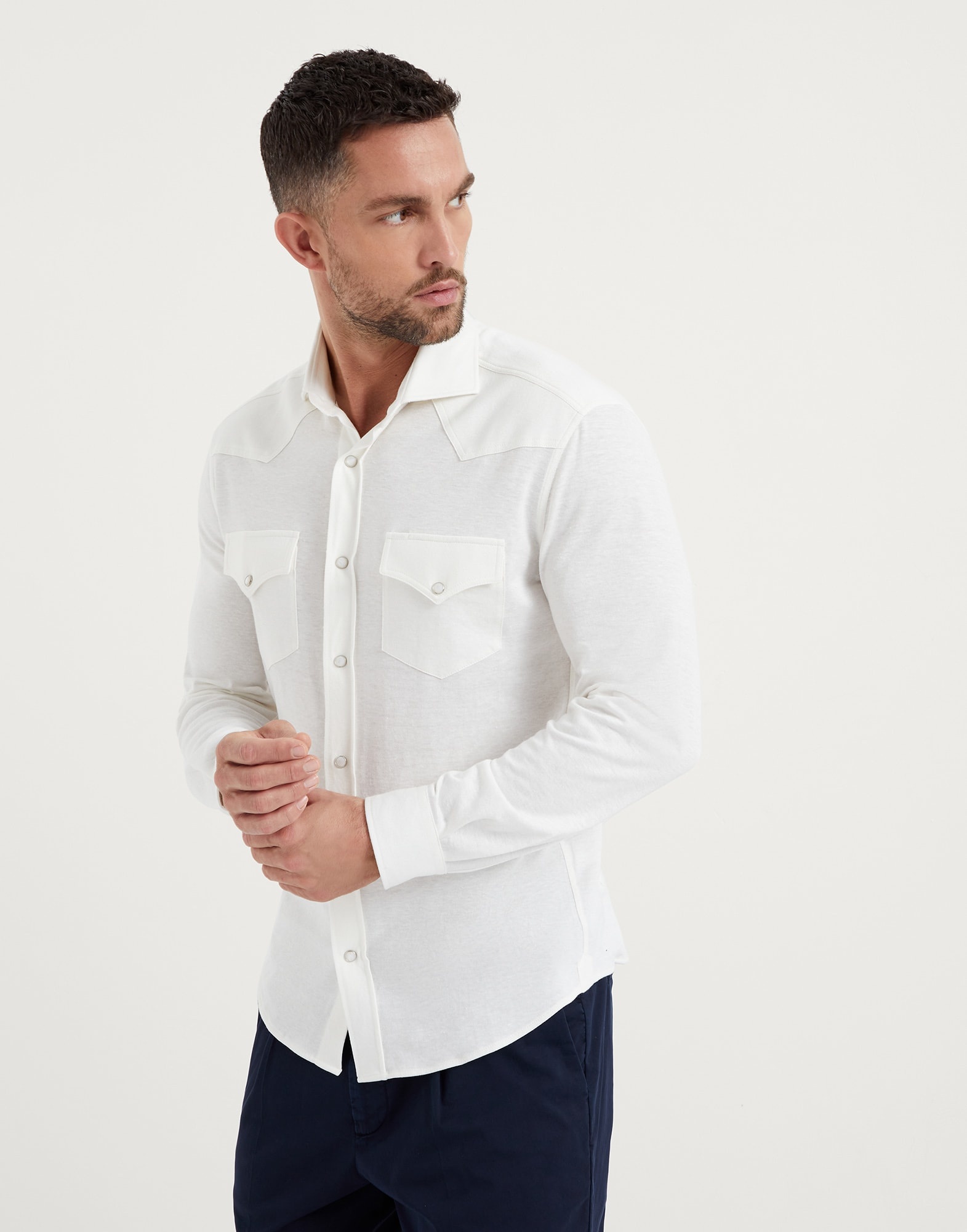 The sporty look of linen and cotton jersey is paired with western-inspired details, such as snaps, a pronounced yoke and flap pockets, to create a sophisticated, casual contrast with the classic codes of the shirt. The slim fit offers lines that remain close to the body. MATERIALS The linen and cotton jersey fabric is characterized by a summery feel and a lightweight texture, with the linen providing freshness and the cotton adding a soft touch. The irregular yarn colors enhance the surface’s subtle mottled effect. DETAILS Placket closure with snaps Classic collar Two patch chest pockets with flap and button Yoke 57% LINEN, 43% COTTON