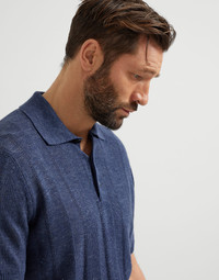 An icon of casual wear, this short sleeve polo is updated thanks to the selection of refined yarns and the artisanal workmanship of Brunello Cucinelli knitwear. The linen and cotton knit showcases a light, naturally mottled texture that is ideal for warm weather, enriched by a particular wide ribbed stitch. The proportions are regular and comfortable. MATERIALS The combination of natural linen and cotton fibers creates a fine yarn with a slightly irregular thickness. Lightweight and pleasant to wear, the texture is enriched by the slubbed characteristic of the linen, which gives the garment a sophisticated and fresh character. DETAILS Shirt-style collar with button opening Regular shoulder Rib knit cuffs and bottom band Rib knit 77% LINEN, 23% COTTON
